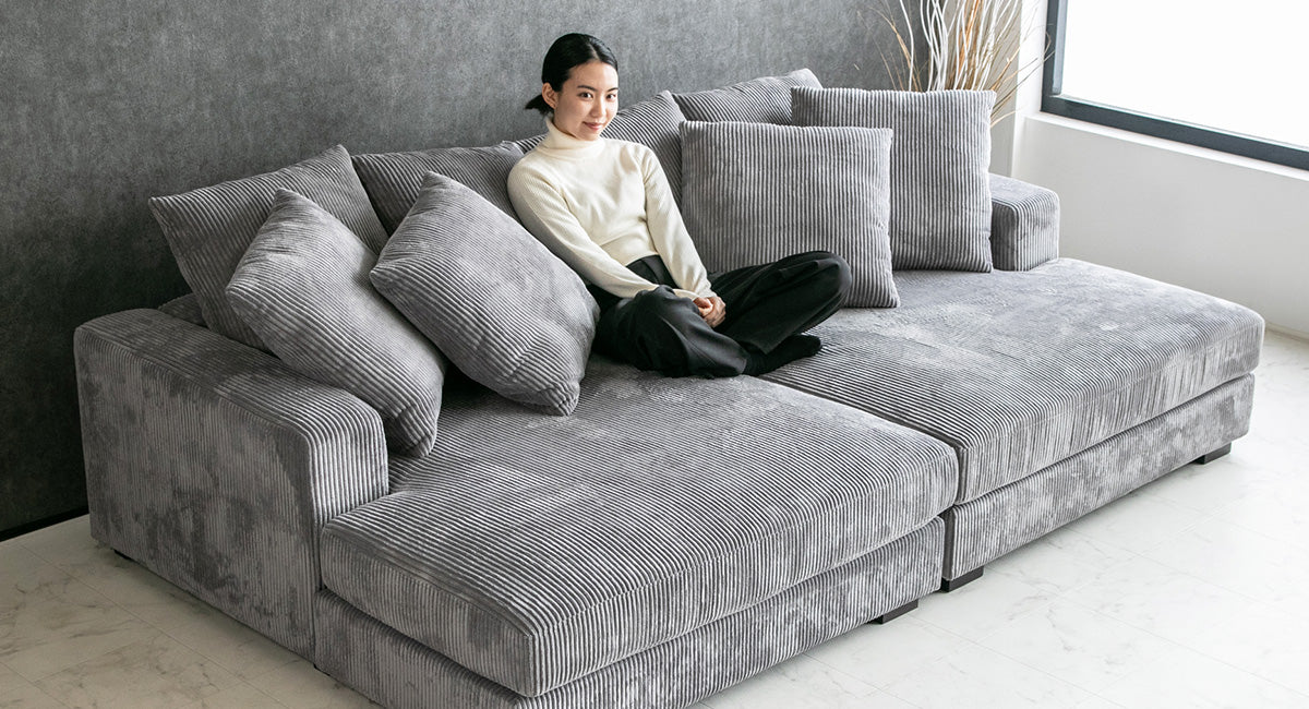 ディープソファ 3人掛け 4人掛け 太畝 コーデュロイ ファブリック ローソファ グレー クッション付き 幅220cm ベッファー beffar