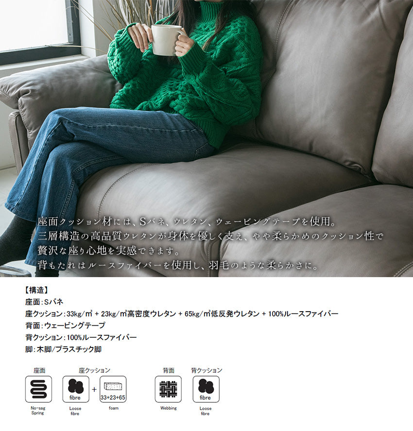 | 材質 | 座面:Sバネ 座クッション:高密度ウレタン + 低反発ウレタン + 100%ルースファイバー 背面:ウェービングテープ 背クッション:100%ルースファイバー 脚:木脚/プラスチック脚 |