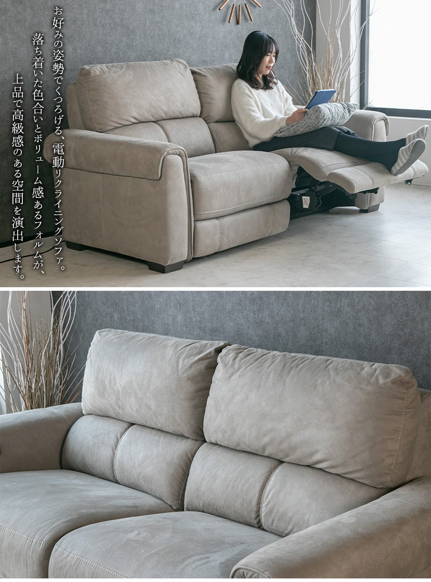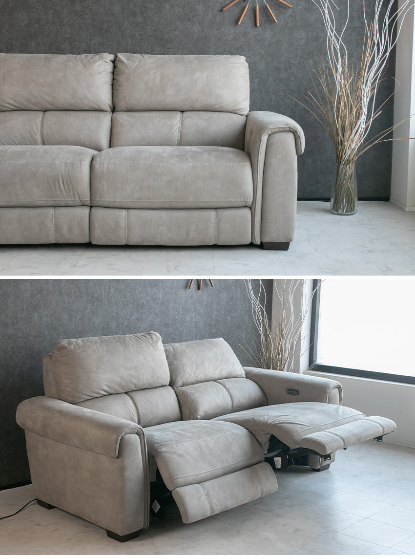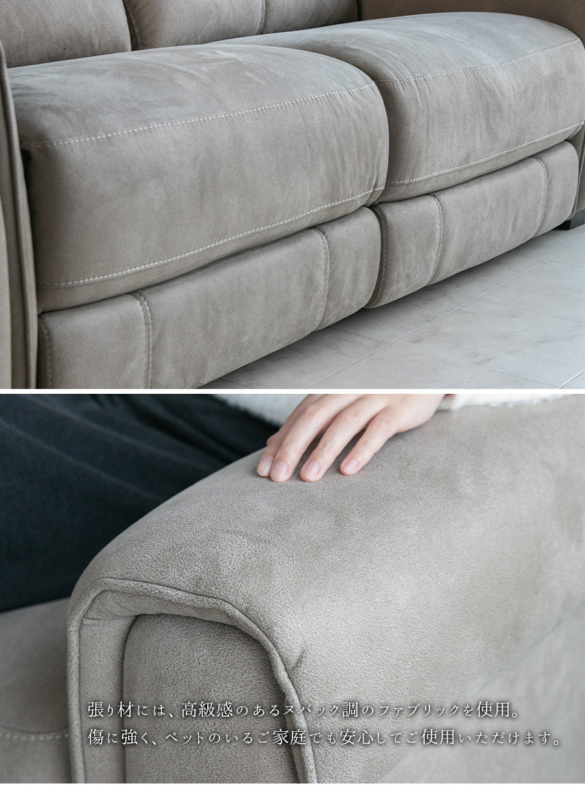 | 商品説明 | 肌触り滑らかなヌバック調のファブリックを使用した、電動リクライニングソファ。 |