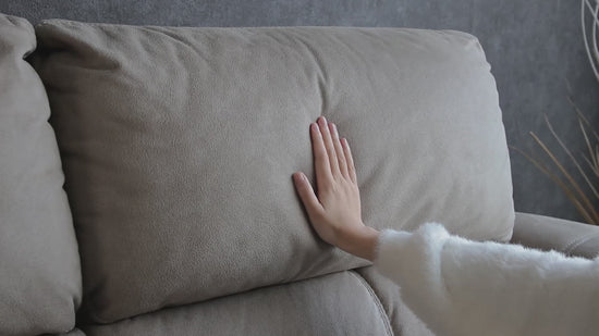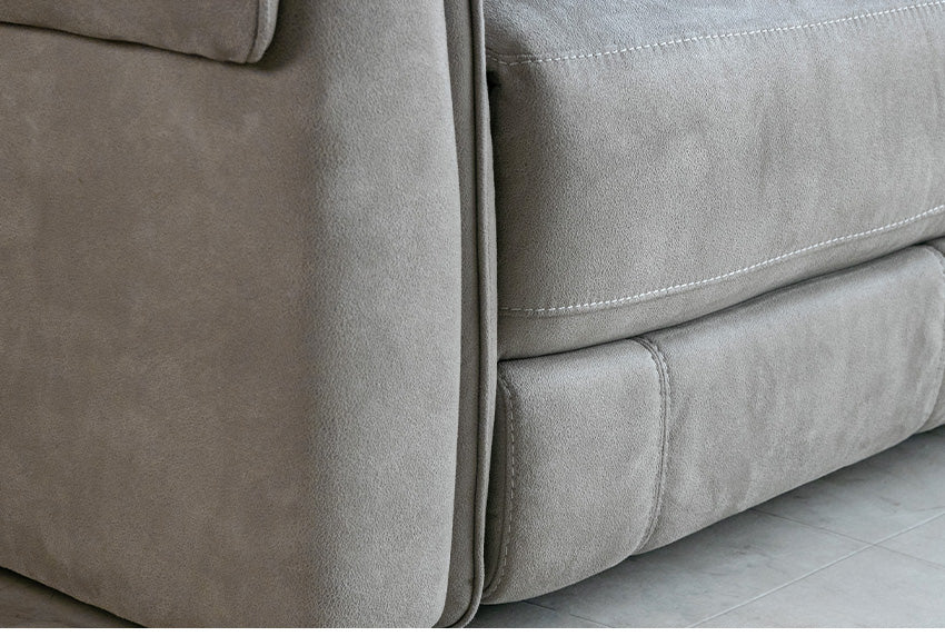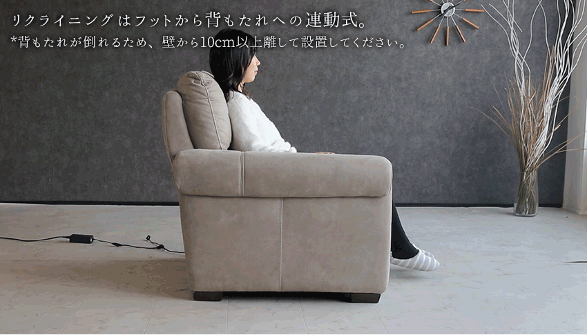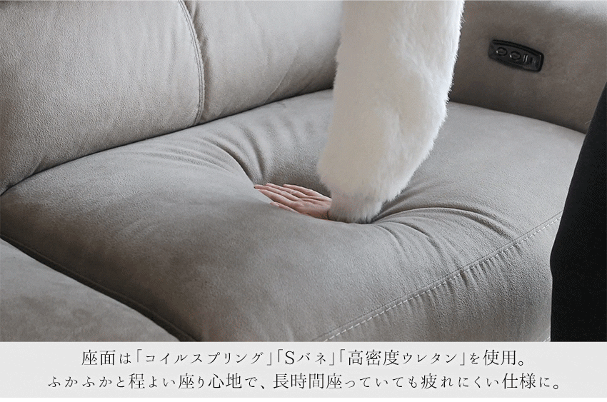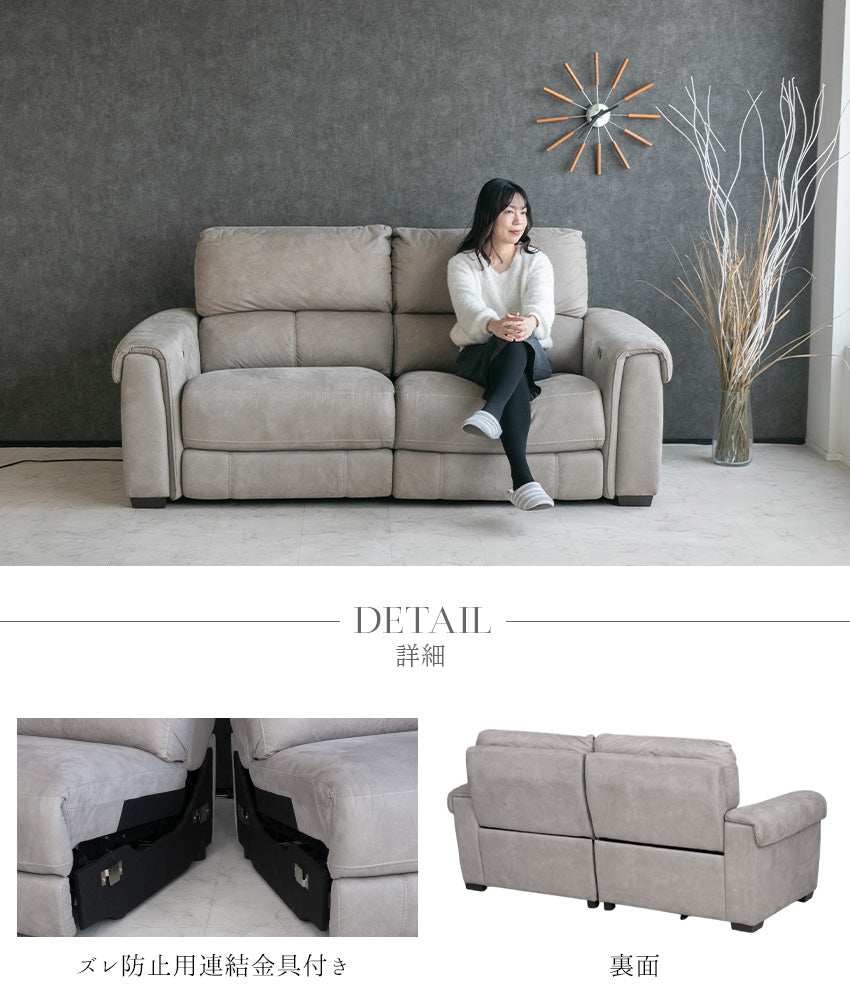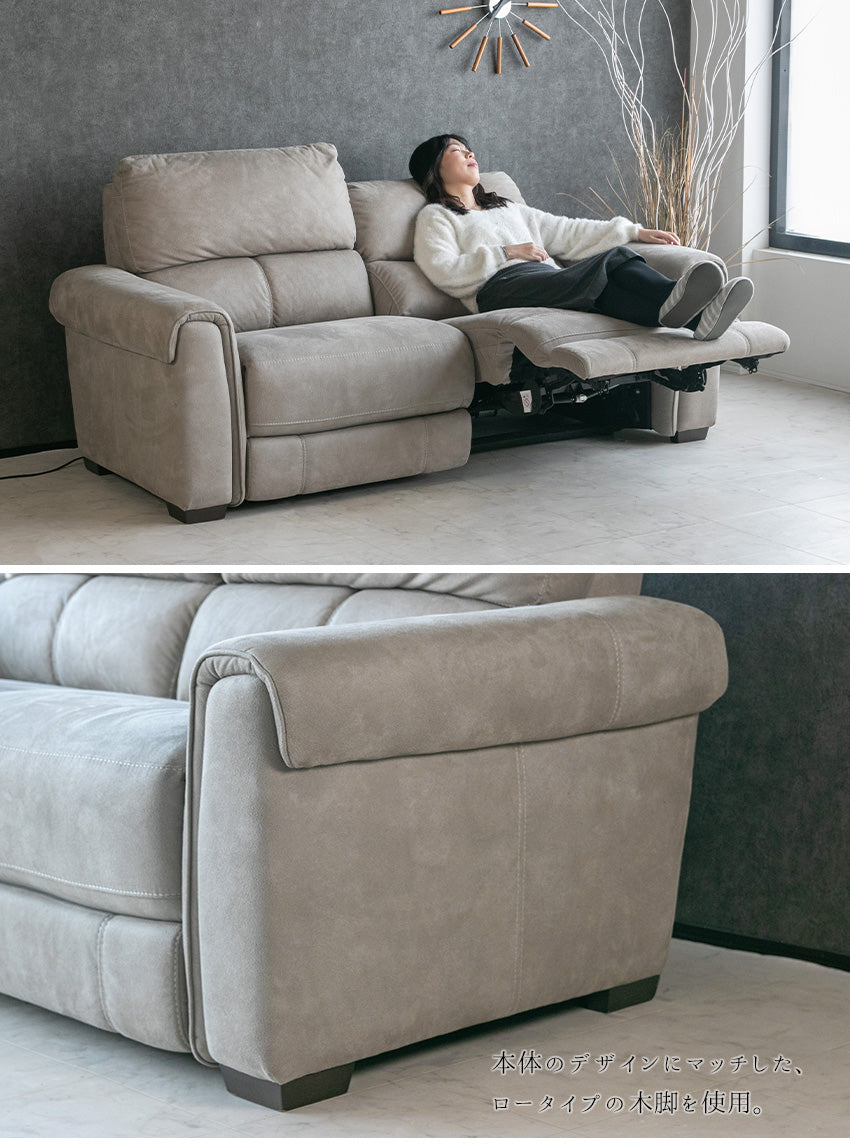 | 商品説明 | 肌触り滑らかなヌバック調のファブリックを使用した、電動リクライニングソファ。 |
