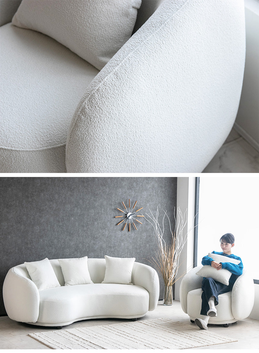 | 材質 | 木製フレーム/Sバネ/ウェービング/ウレタン/ブークレ生地(ポリエステル) こちらの商品は生地サンプルのご用意が可能です。 ご希望の場合、お問い合わせフォームより、■送付先氏名 ■送付先住所 ■商品番号[10205] を入力の上、お問い合わせくださいませ。を入力の上、お問い合わせくださいませ。 ※生産ロットによって色味が若干異なる場合がございます。 |