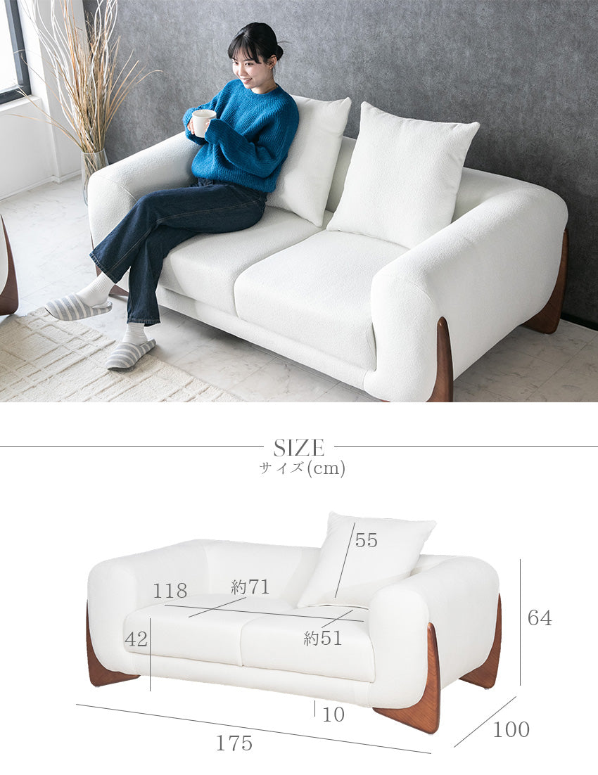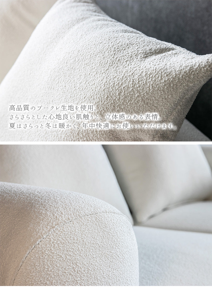 | 材質 | 木製フレーム/Sバネ/ウェービング/ウレタン/ブークレ生地(ポリエステル) こちらの商品は生地サンプルのご用意が可能です。 ご希望の場合、お問い合わせフォームより、■送付先氏名 ■送付先住所 ■商品番号[10206] を入力の上、お問い合わせくださいませ。を入力の上、お問い合わせくださいませ。 ※生産ロットによって色味が若干異なる場合がございます。 |