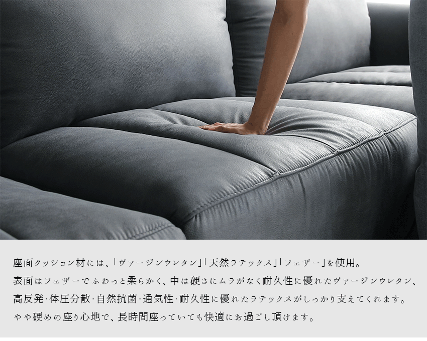 | 材質 | 張り材:ファブリック(Like Leather) 材質:ヴァージンウレタン、ラテックス、フェザー |