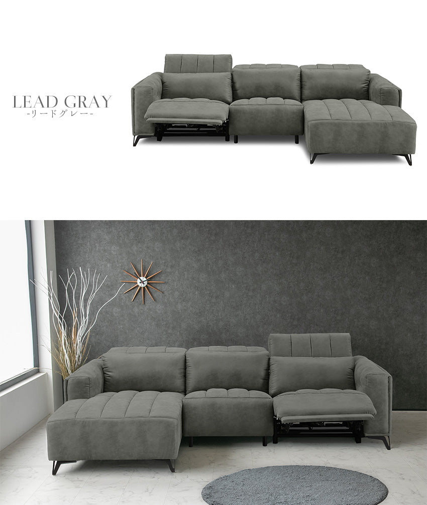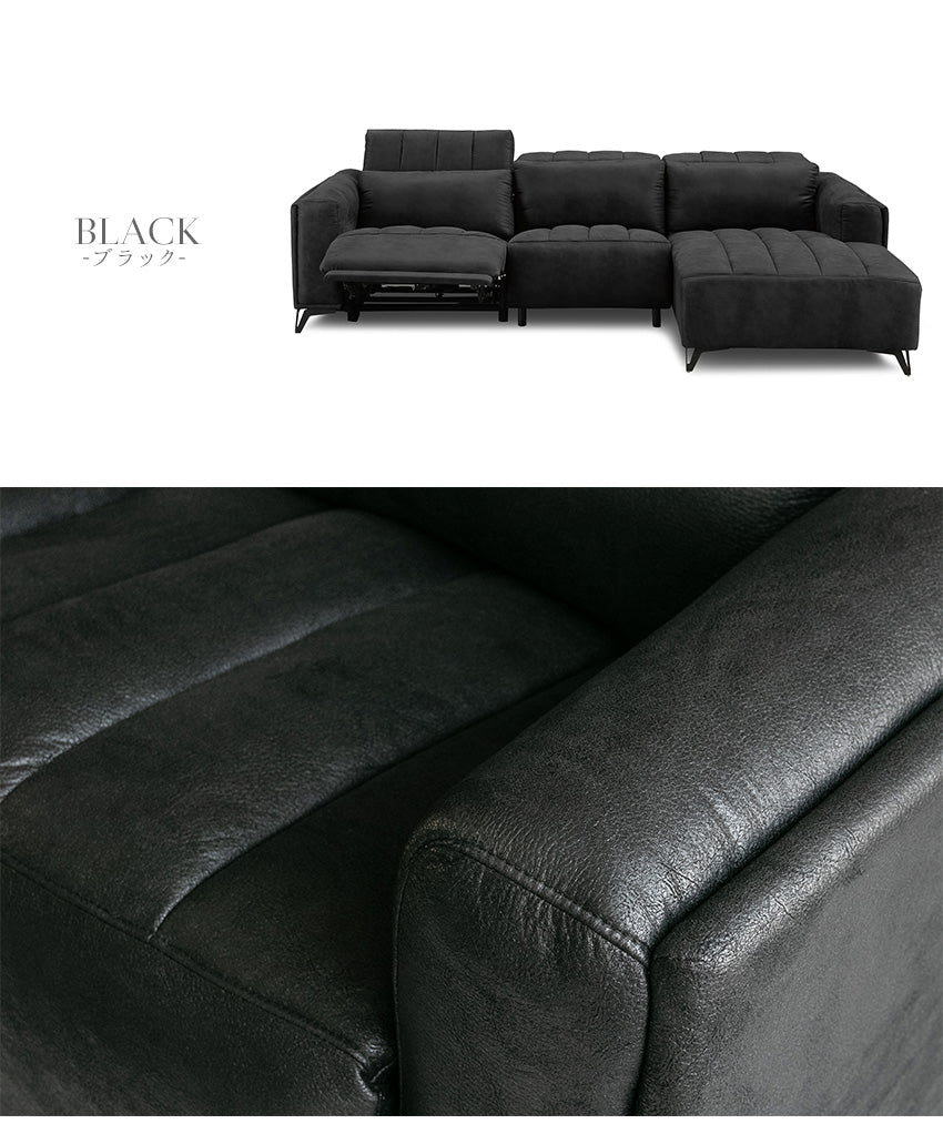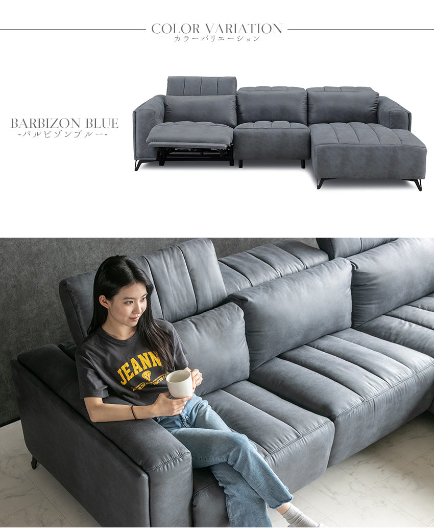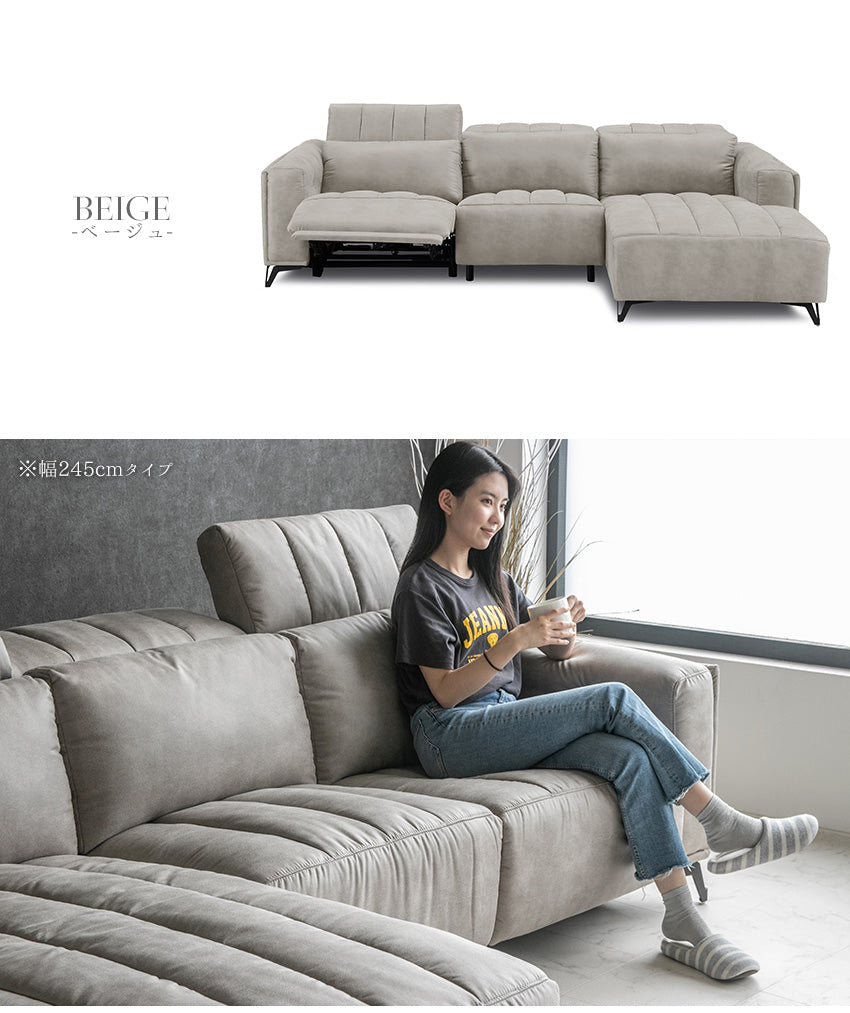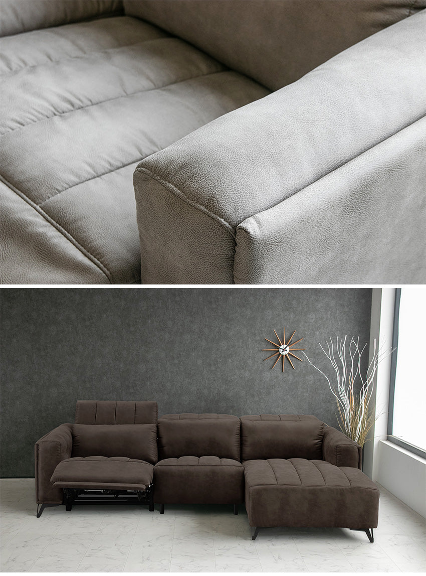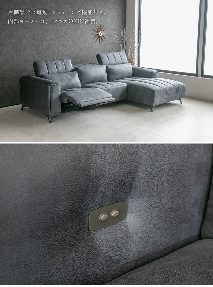 | 商品説明 | 柔らかな肌触りのファブリックレザーを使用した、電動リクライニングカウチソファ。 |