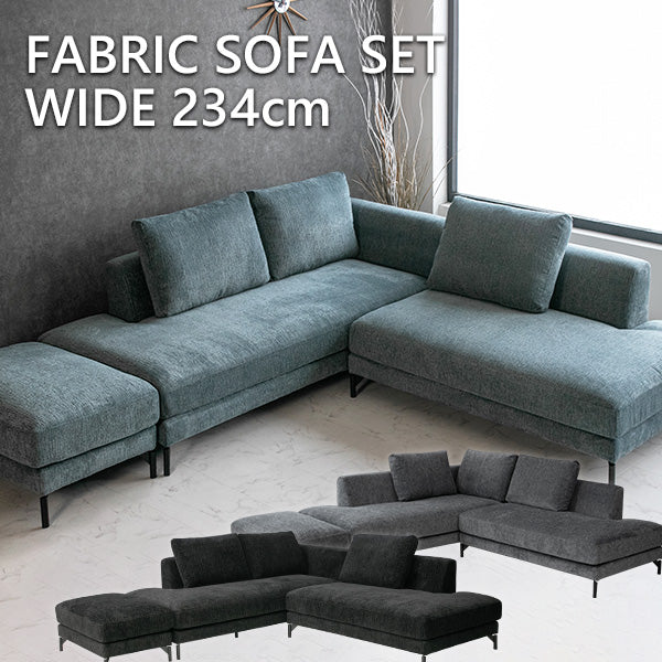 カウチソファ 3人掛け 4人掛けファブリック I字 ブラック グレー ライトブルー クッション付き 幅234cm