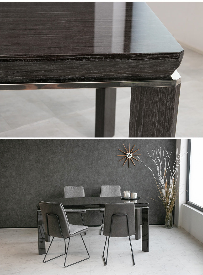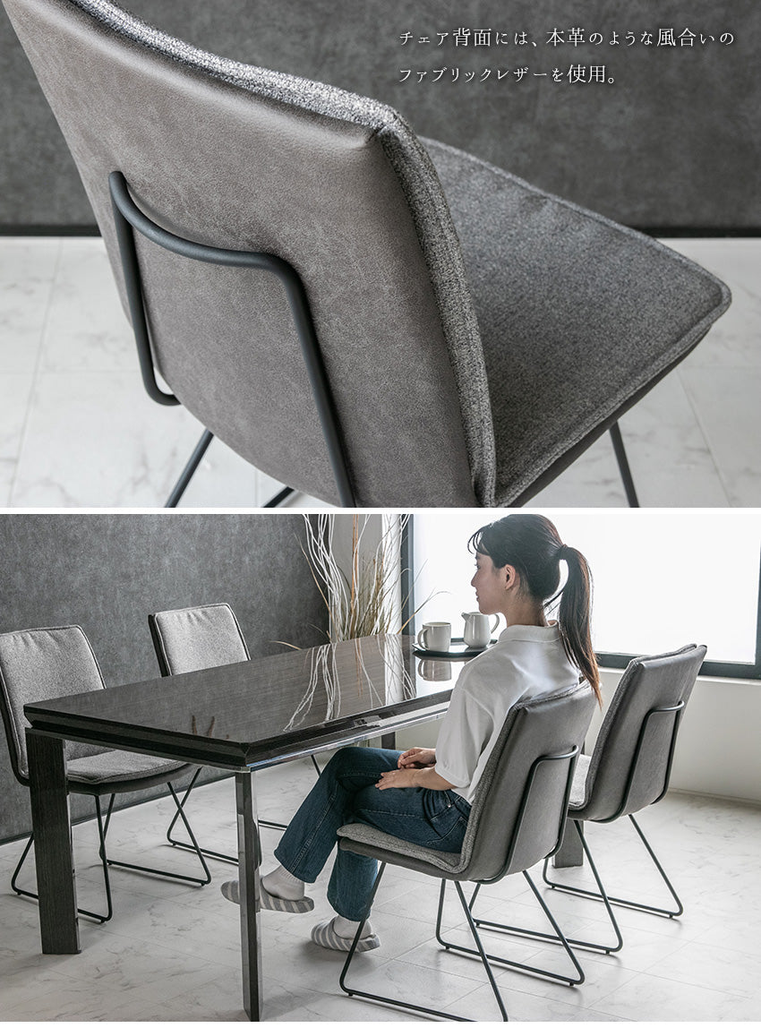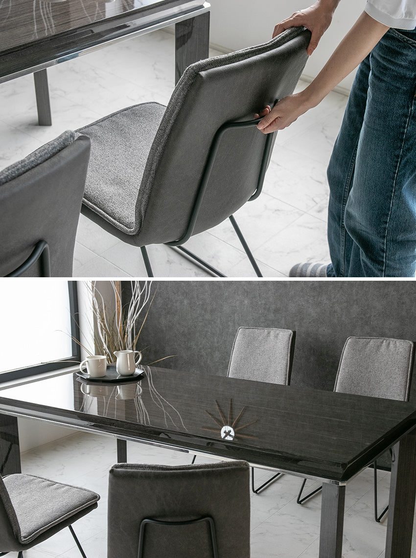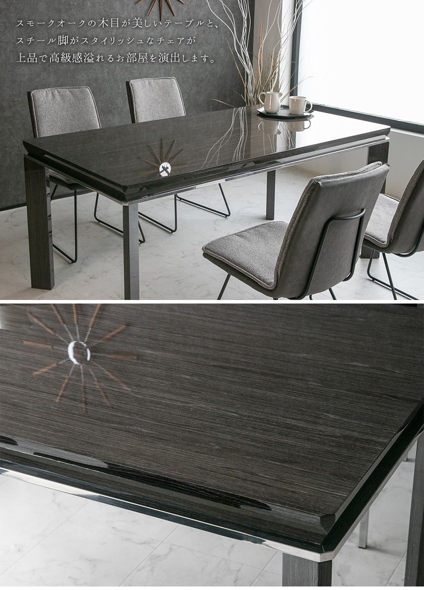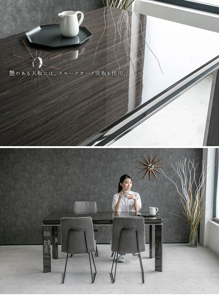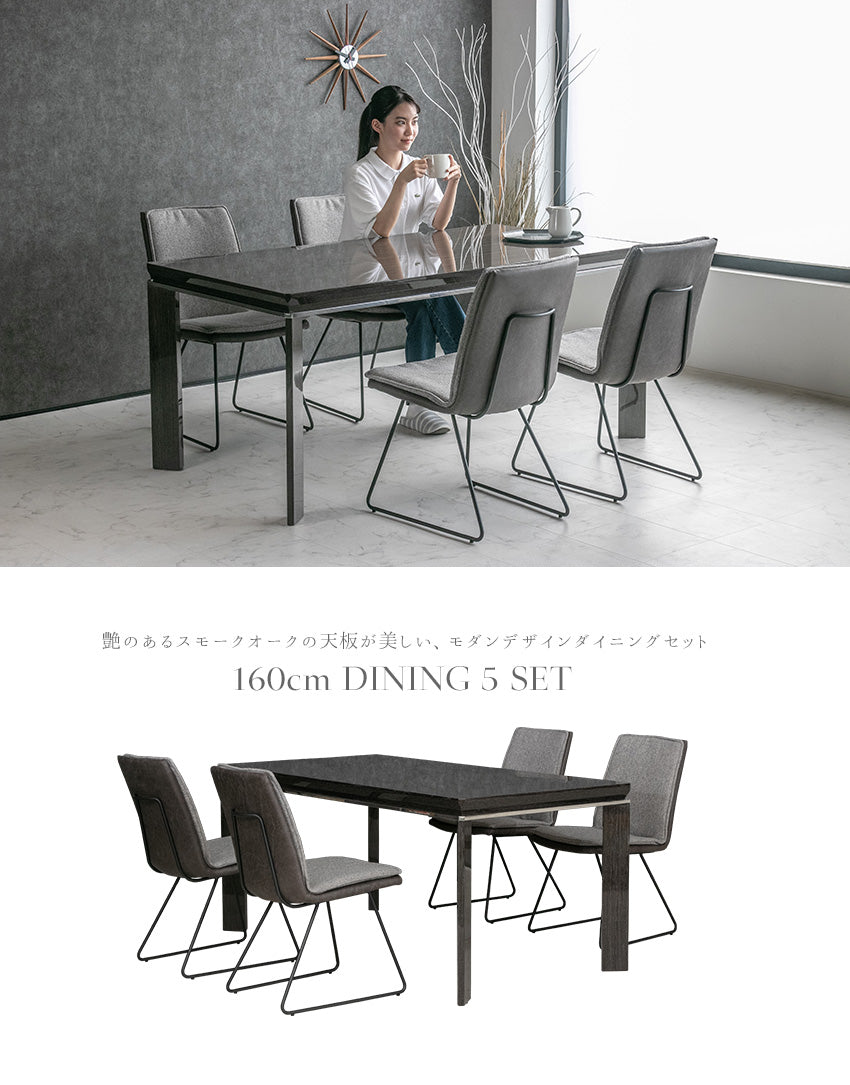 | 商品説明 | 艶のあるスモークオークの天板が美しい、160cm幅モダンデザインダイニングセット。 |