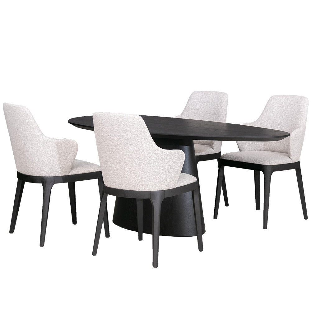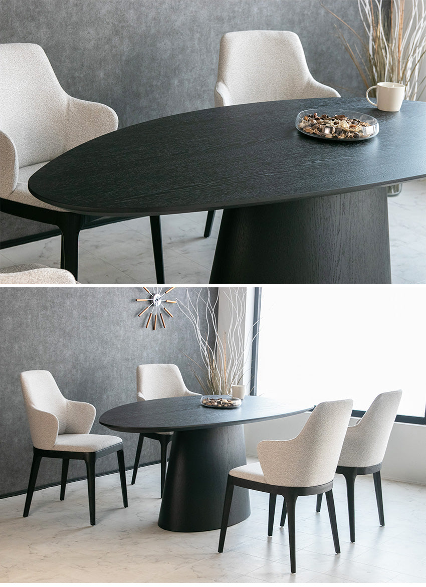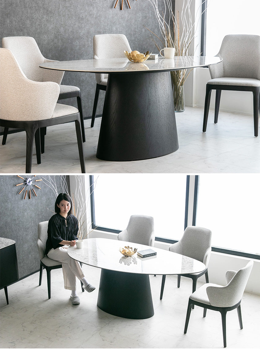 | 商品説明 | スタイリッシュな楕円形の天板が美しい、モダンデザインダイニング5点セット。 |