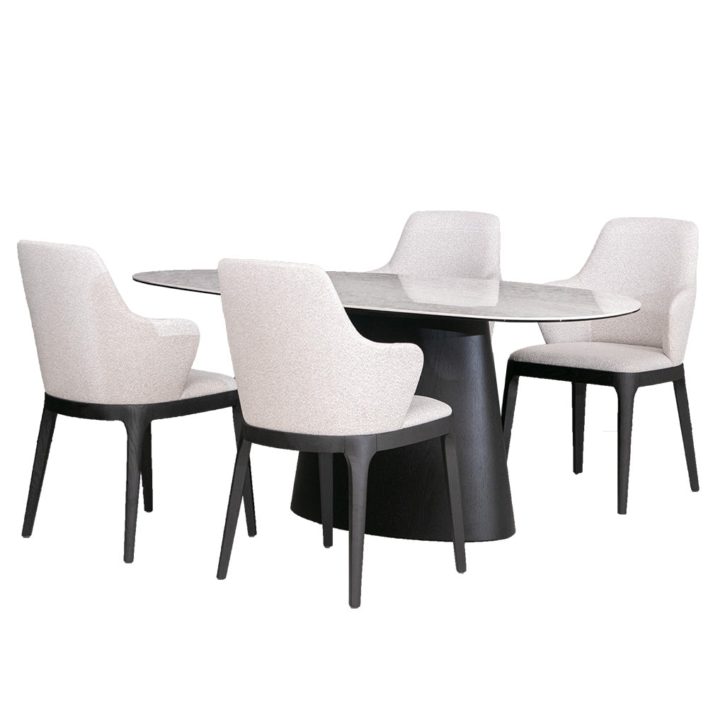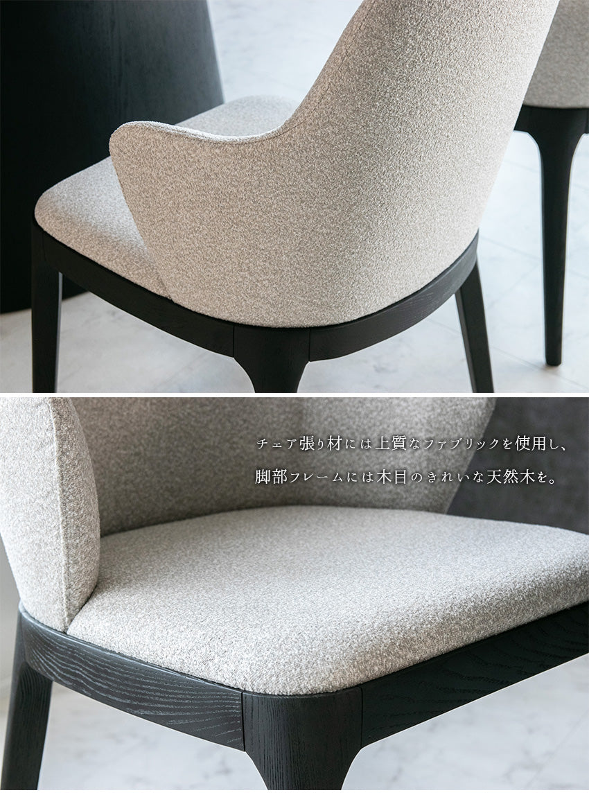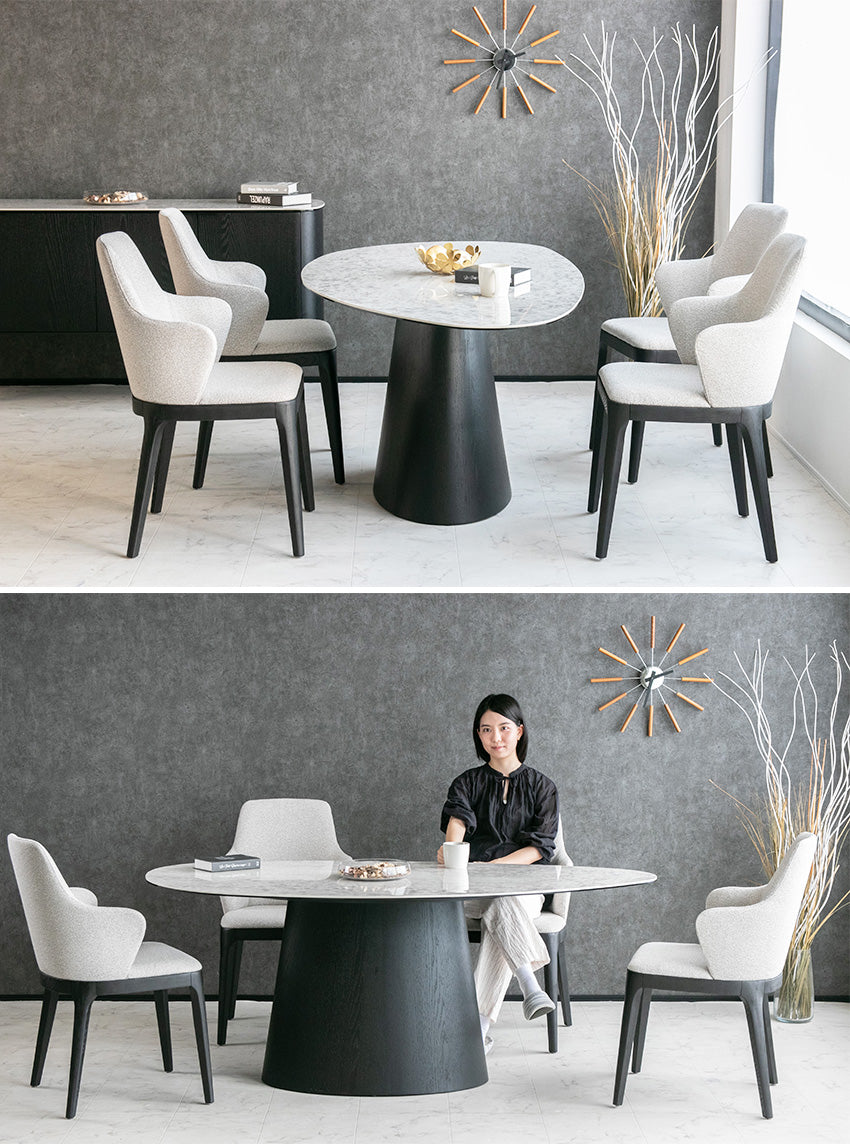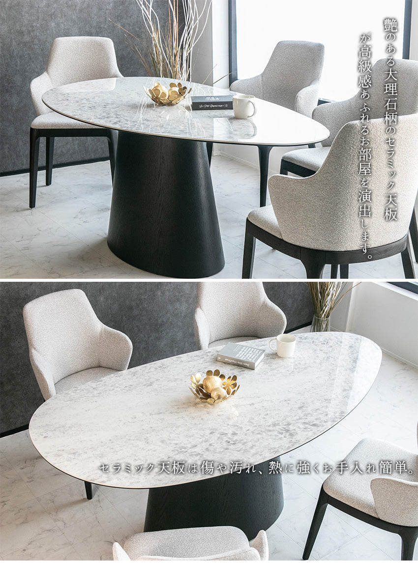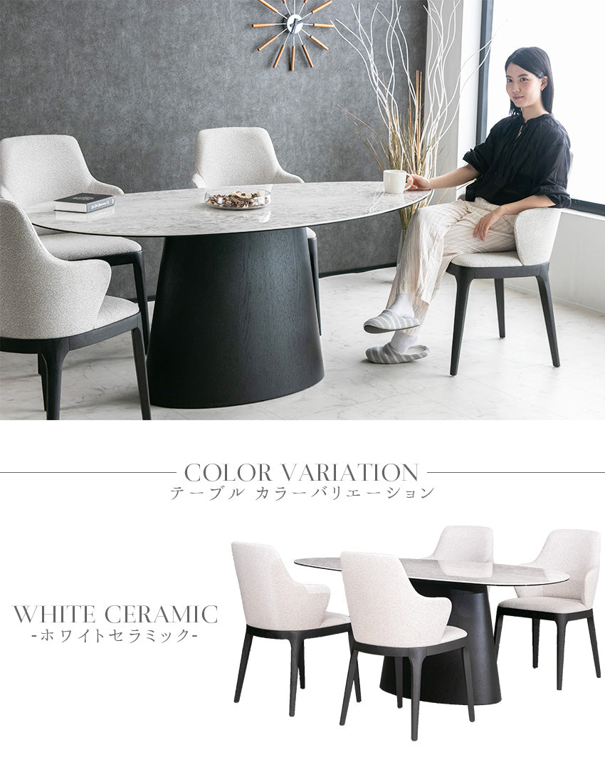 | 材質 | テーブル:セラミック/オーク材 チェアー:ファブリック、オーク材 |